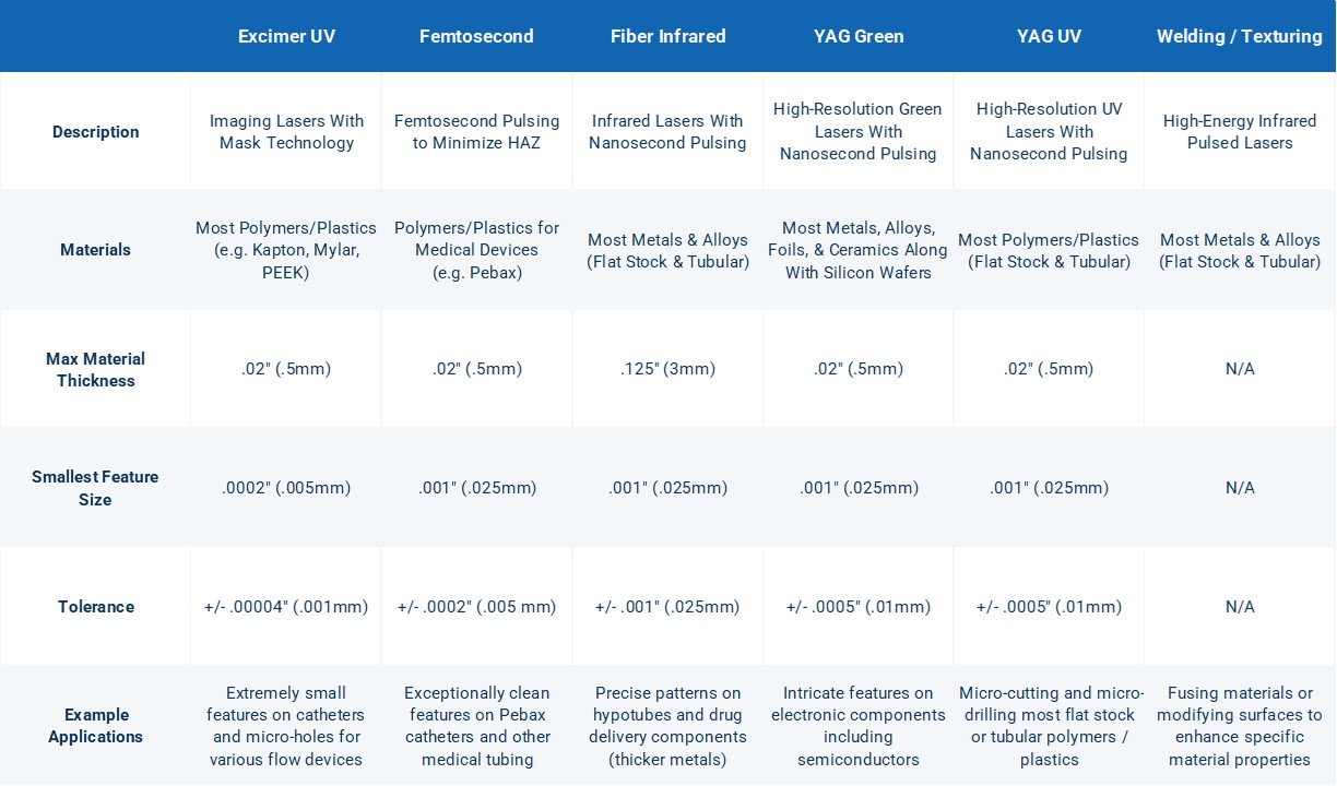 Our 17,000 sq. ft. facility houses over 20 laser systems including 7+ classes of lasers (Excimer, Femtosecond, Fiber Infrared, Green, UV, Welding/Texturing, and Marking). This allows us to cover a wide range of applications and materials (most polymers/plastics, metals, and ceramics). Since we focus entirely on small parts, each laser system is tailored for a specific job to ensure exceptional quality and quick turnarounds.